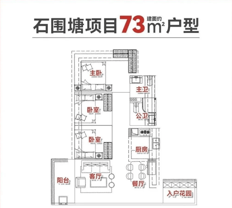 该户型采用竖厅布局,三开间朝南,采光充足,无暗角,不管是客厅、主卧,还是次卧,都能享受到充足的阳光,日常居住十分舒适。主卧带270°转角飘窗,既提升了视野,又增加了实用面积,平时可以在这里看书、晒太阳,十分惬意。另外两个次卧空间方正,没有面积浪费,可作儿童房或书房,满足不同的居住需求——如果是三口之家,可以把其中一个次卧改成书房,方便工作、学习;如果有二胎,可以改成儿童房,轻松应对家庭人口增加的需求。